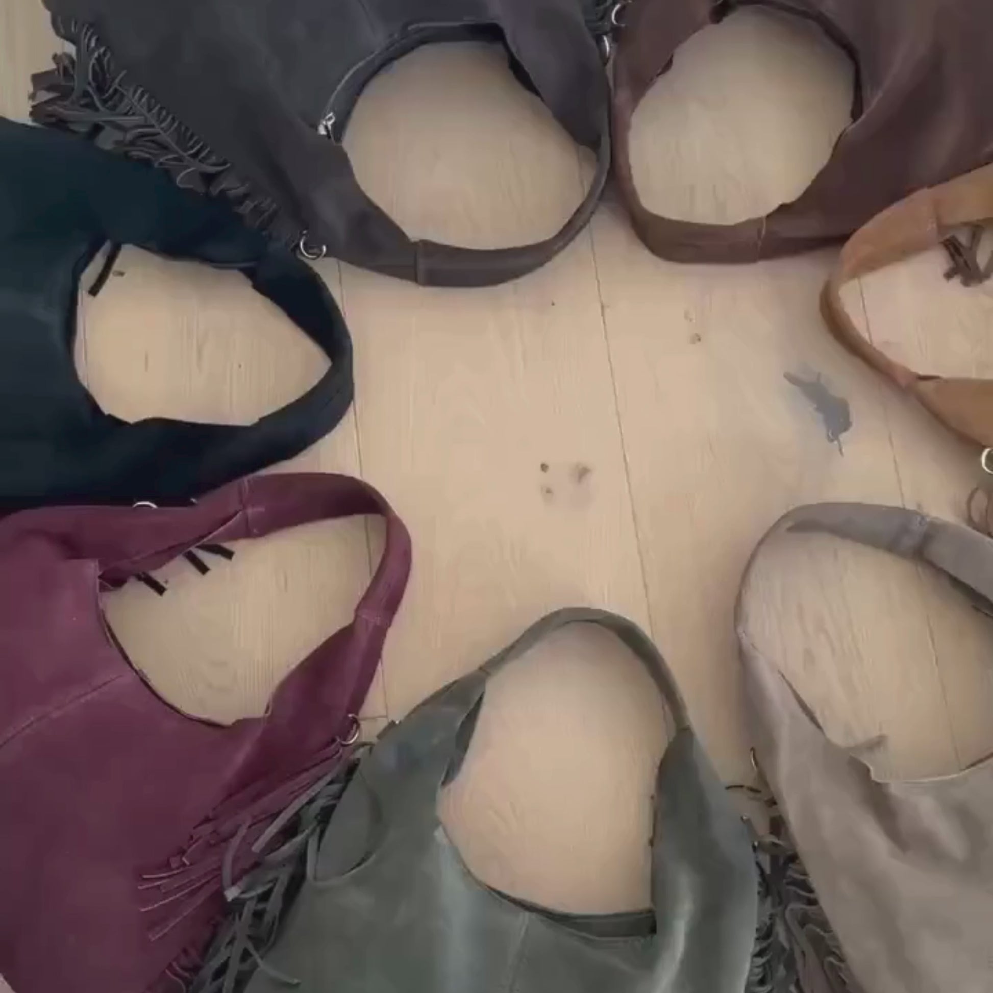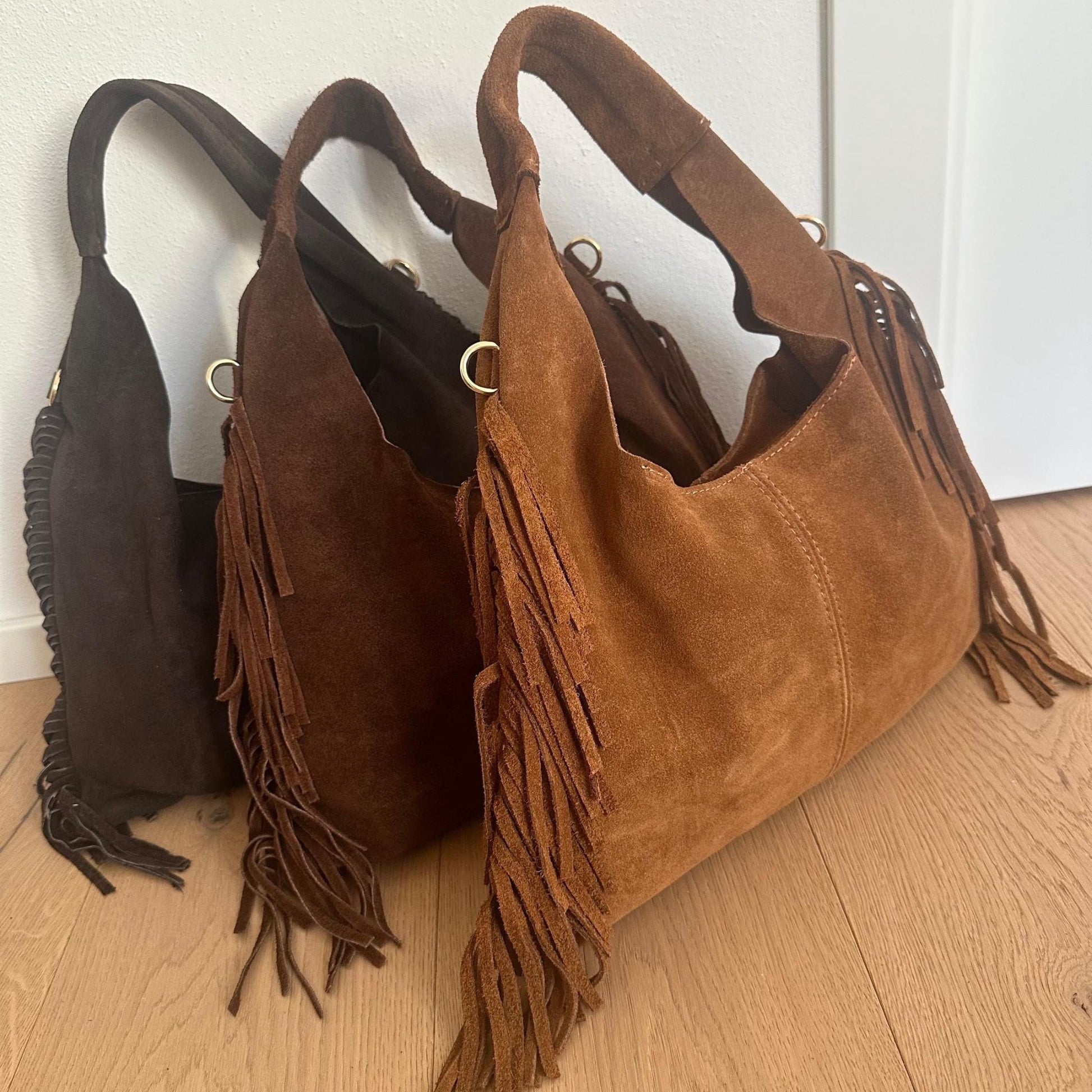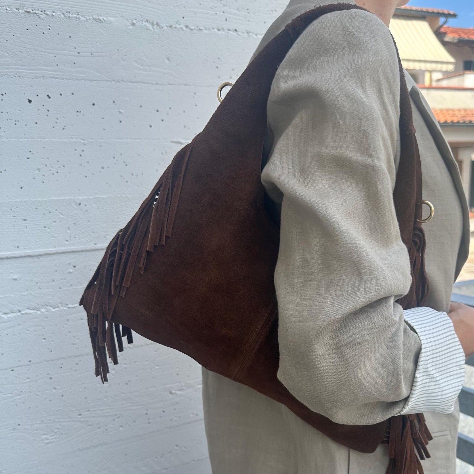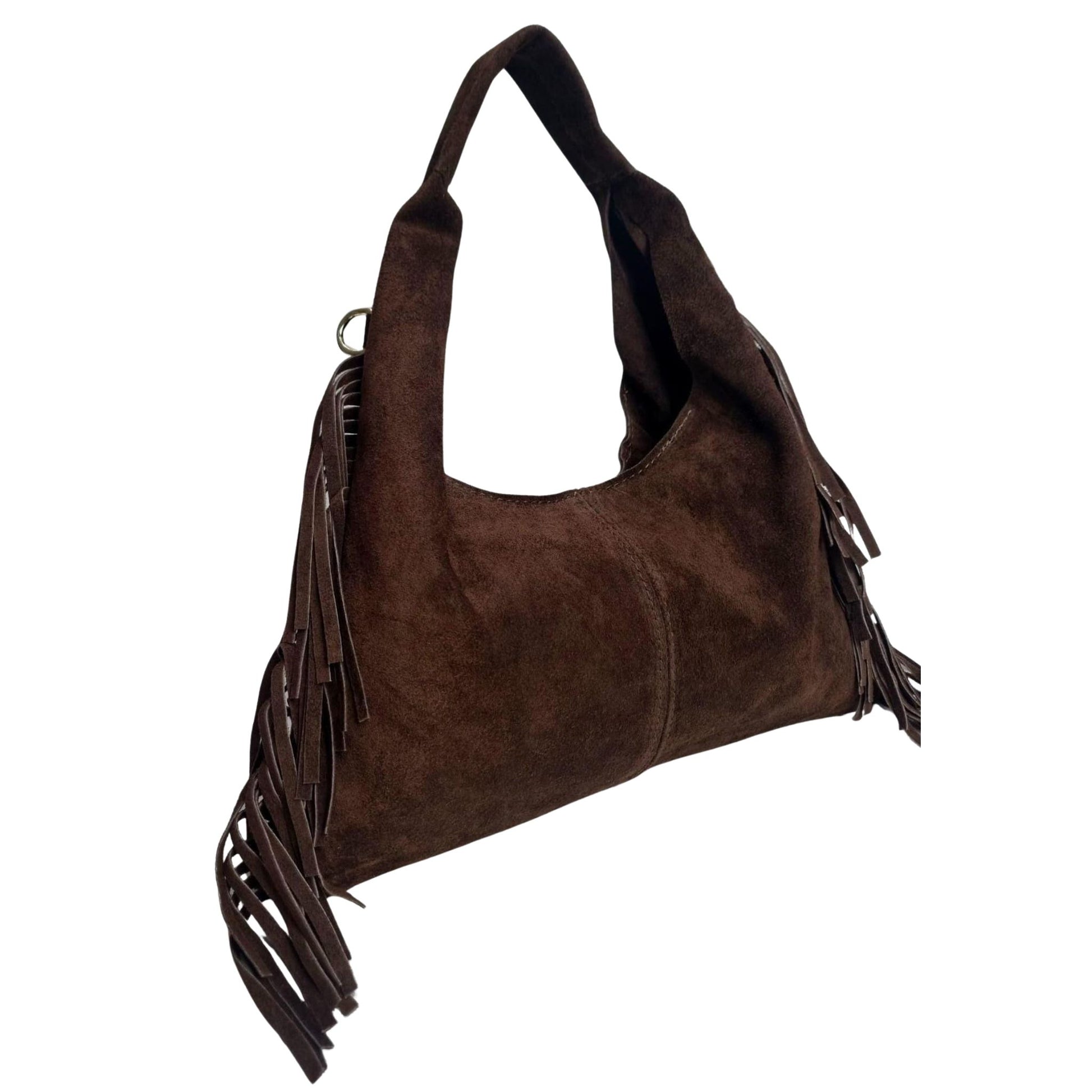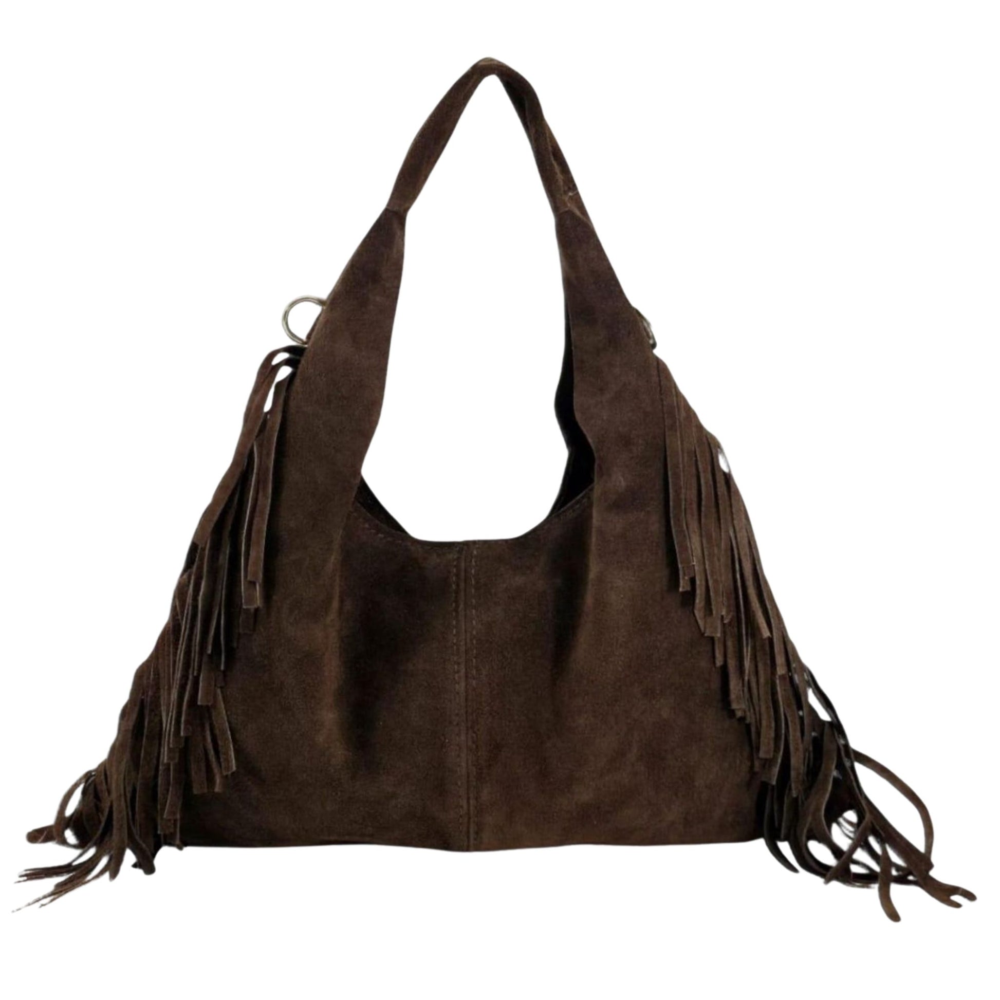 Bolso de ante y flecos laterales de forma triangular, con asa principal e interior con bolsillo lateral