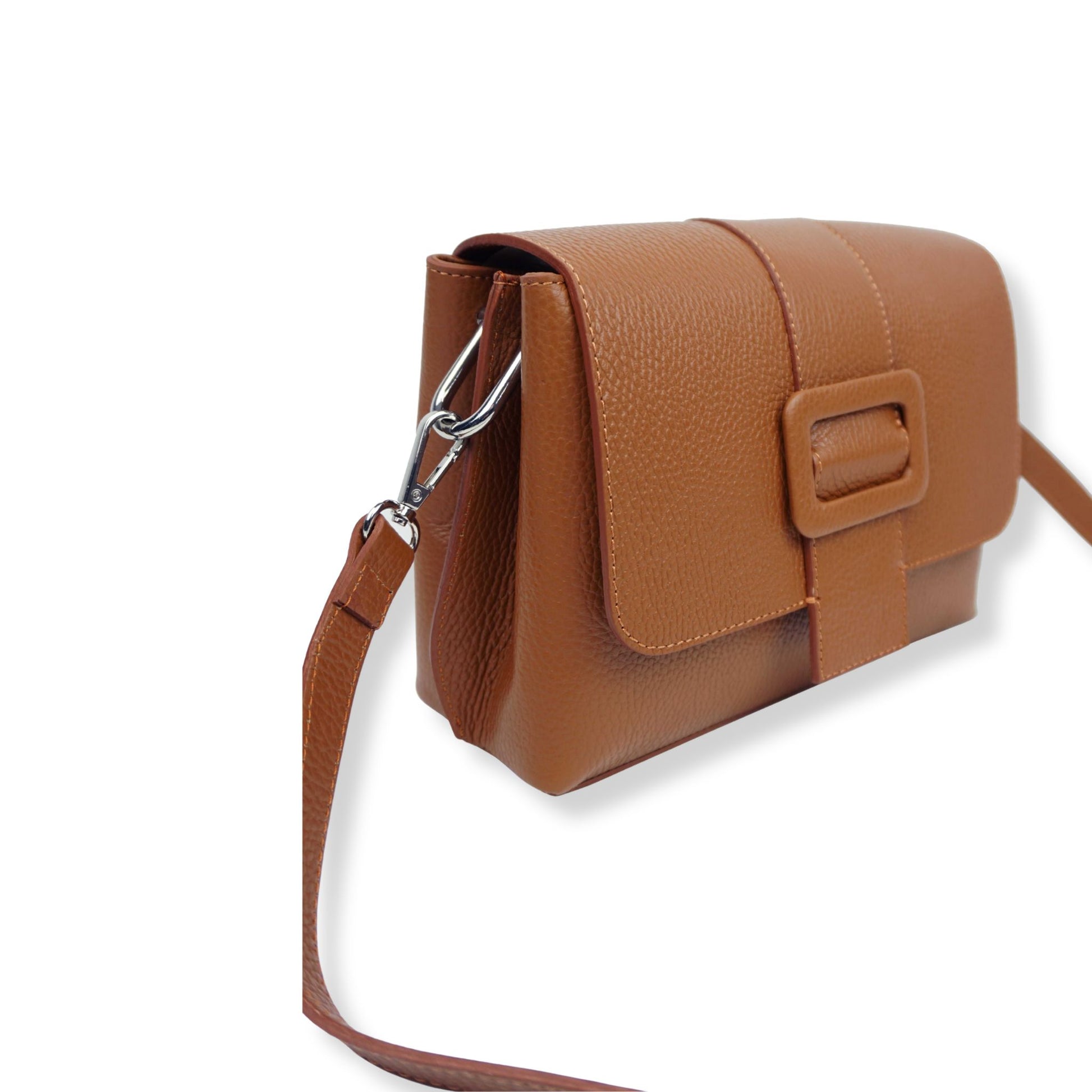 Eleva tu look con este bolso de piel Italiana de grano medio, su forma estructurada es ideal para elevar tus outfits, su forma estructurada y su cierre con solapa a presión permite ir cómoda y elegante. Interior forrado en tela con bolsillo central con cremallera y dos bolsillos adicionales pequeños